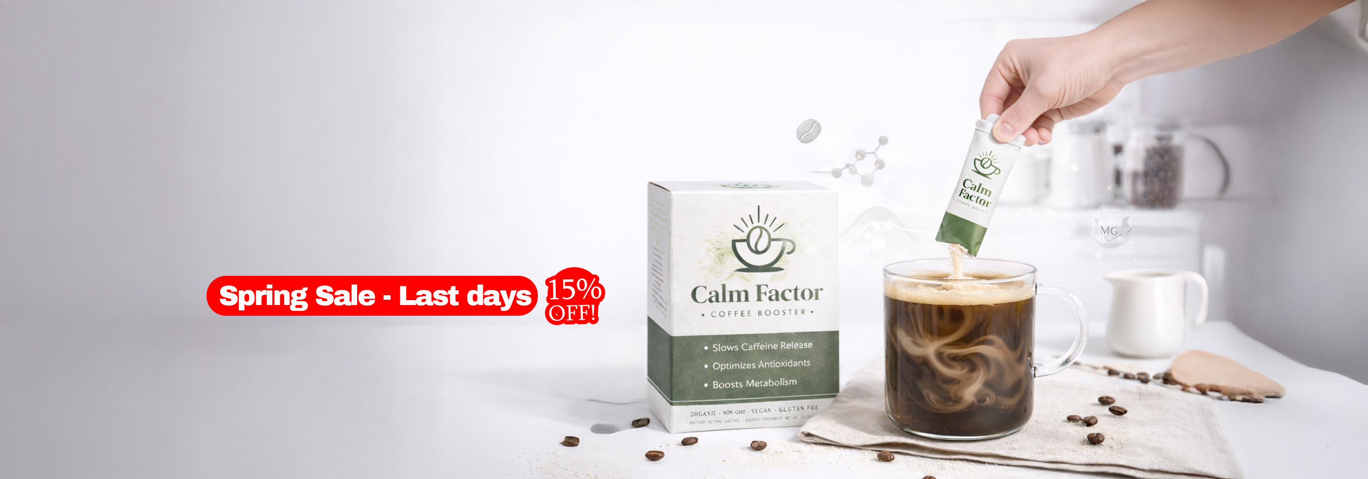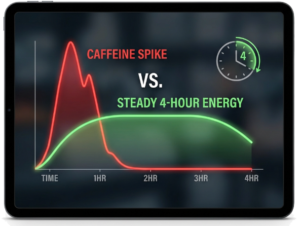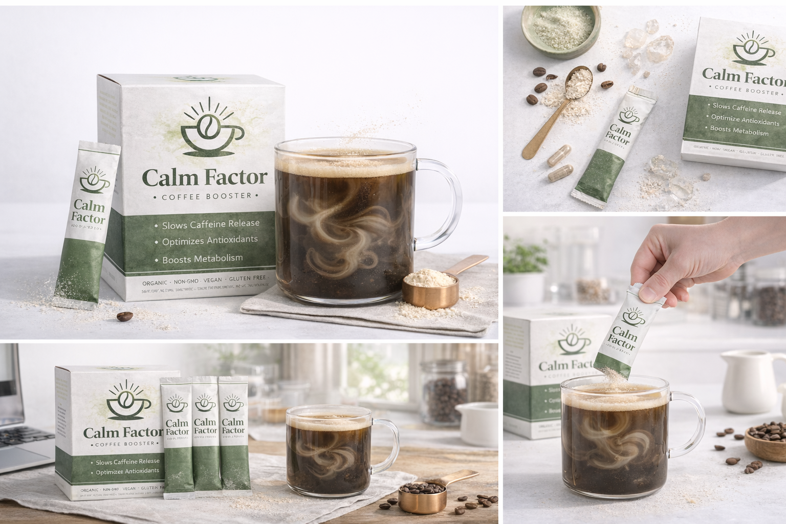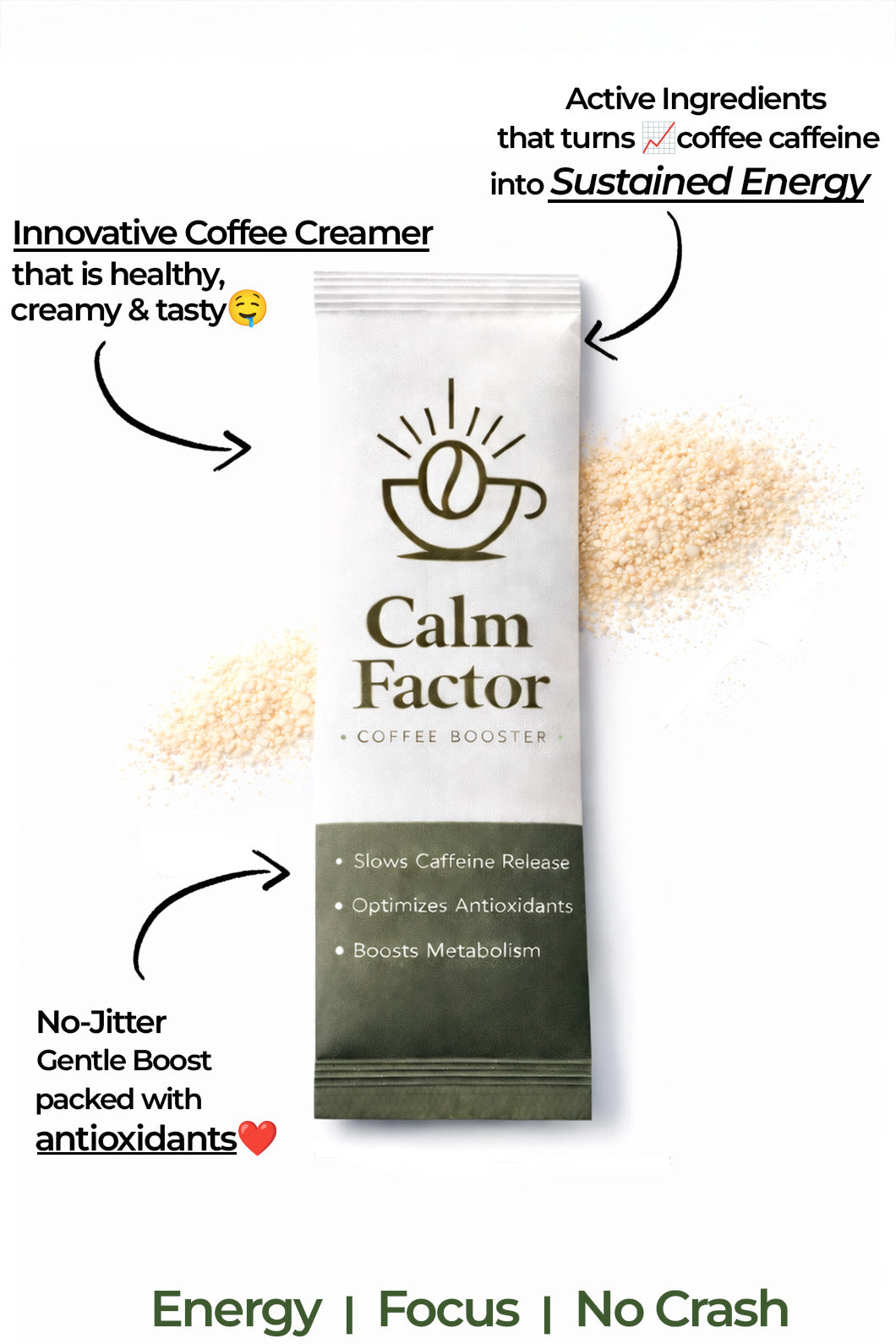 Normally coffee's caffeine spikes up and lasts for max 1 hour, making you tired afterwards. Calm Factor's innovative formula transforms coffee's caffeine into lasting steady energy up to 4 hours, by stabilizing coffee's caffeine.
