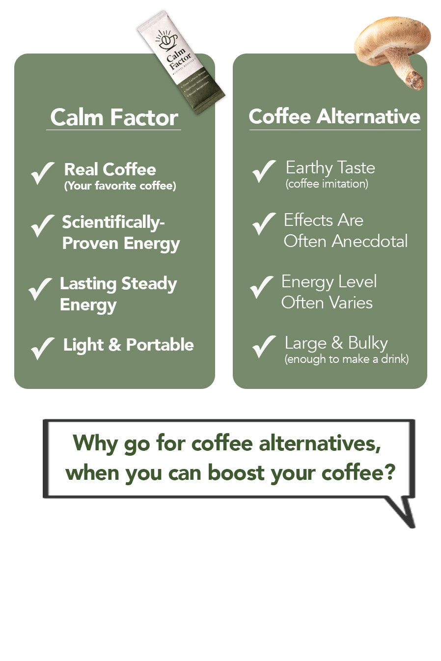 Unlike other coffee alternatives, you don't have to compromise on the taste! Calm Factor is formulated to be neutral in taste. Simply add Calm Factor to your favorite cup of coffee to enjoy the coffee you love - just creamier, and healthier.